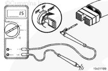 萬用表的一支表筆接觸開關的 SET/COAST(設置/滑行)端子。用萬用表的另一支表筆接觸底盤接地端。將該開關撥到 RESUME/ACCEL(恢復/加速)位置,然后再到 SET/COAST(設置/滑行)位置。測量電阻。