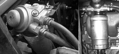 排放燃油系統(tǒng)中的空氣時,應該先旋轉(zhuǎn)燃油濾清器頂部的放氣螺栓(上圖所示),將其松開,按壓手油泵,直到從放氣孔中流出無空氣的燃油。緊固放氣螺塞,手油泵集成在濾清器上端。