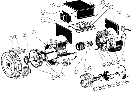1—前端蓋;2—出風蓋板;3—軸承;4—定子;5—端子箱側板;6—電壓調節器;7—調節器支架;8—端子箱頂蓋;9—端子箱前后板;10—接線板;11—接線板支架;12—端子箱側板;13—吊攀;14—軸承蓋;15—進風蓋板;16—后端蓋;17—勵磁定子;18—勵磁定子固定螺栓;19—軸承;20—旋轉整流器;21—勵磁電樞;22—接地牌;23—轉子;24—風扇;25—永磁機機殼;26—永磁機轉軸;27—永磁機轉子;28—永磁機定子;29—永磁機定子固定螺栓;30—永磁機轉子固定螺栓;31—墊圈;32—永磁機蓋板