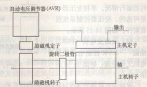 同步發(fā)電機一般由自動電壓調(diào)節(jié)器(AVR),勵磁發(fā)電機,旋轉(zhuǎn)整流器,主發(fā)電機幾個部分組成。同步發(fā)電機的構(gòu)造原理圖如下所示。
