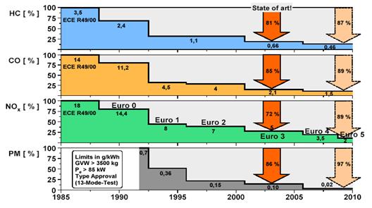 2 、為滿足排放法規所采用的技術 歐洲1號和2號標準:使用機械控制噴油系統即可達標。歐洲3號標準:必須使用電子控制噴油系統。共軌式系統、電控單體泵,電控泵噴嘴系統,蓄壓增壓電噴系統(HEUI)和直列泵分配泵電控系統能夠滿足這個標準。
