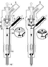 噴油器可以被拆分為一系列功能部件:孔式噴油嘴,液壓伺服系統和電磁閥。燃油來自于高壓油路,經通道流向噴油嘴,同時經節流孔流向控制腔,控制腔與燃油回路相連,途徑一個受電磁閥控制其開關的泄油孔。泄油孔關閉時,作用于針閥控制活塞的液壓力超過了它在噴油嘴針閥承壓面的力,結果,針閥被迫進入閥座且將高壓通道與燃燒室隔離,密封。