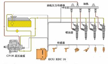 • 共軌系統的高壓部分被分成高壓發生器(高壓泵)、壓力蓄能器(共軌管)和燃油計量元件(電磁閥)。 主要的零部件:配有電磁閥的高壓油泵(CP1H型) 、共軌管、共軌壓力傳感器、噴油器。